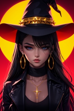 QXHTX,(backlight:1.3),1girl,hat,witch,witch hat,wand,solo,upper body,hair over one eye,jewelry,long hair,chain,earrings,necklace,gold chain,spiked collar,ear piercing,chain necklace,<lora:QXHTX_20240412134359-000008:0.8>,