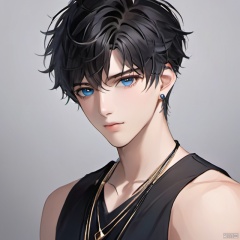 solo, looking at viewer, short hair, bangs, blue eyes, shirt, black hair, 1boy, bare shoulders, jewelry, closed mouth, upper body, male focus, earrings, sleeveless, grey background, necklace, gradient, black shirt, gradient background, sleeveless shirt, portrait,white hair