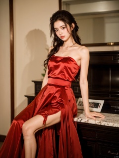1, 1girl, long hair, brown hair, solo, dress, brown eyes, looking at viewer, holding, red dress, parted lips, bare shoulders, indoors, lips, sleeveless, ((poakl)),nice_body,full_body
