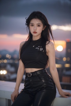 NSFW,Frontal photography,Look front,evening,dark clouds,the setting sun,On the city rooftop,A 20 year old female,Black top,Black Leggings,black hair,long hair, dark theme, muted tones, pastel colors, high contrast, (natural skin texture, A dim light, high clarity) ((sky background))((Facial highlights)), Light master, 1girl