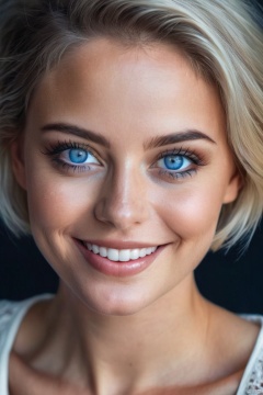 beautiful lady,big smile,blue eyes,short hair,dark makeup,super realistic,hyperdetailed photography,soft light,head and shoulders portrait,cover,