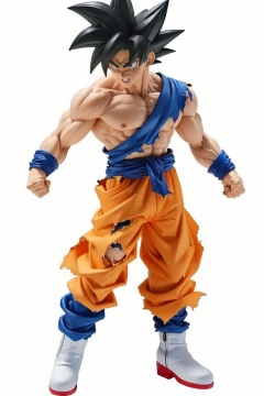 ((HRD, HUD, 8K)),((masterpiece, best quality)), highly detailed,Handmade, 1boy, male focus, solo, blonde hair, son goku, super saiyan, torn clothes, super saiyan 1, white background, spiked hair, dougi, wristband, full body, simple background, muscular, boots, clenched hands, <lora:20240316-1710599536818:0.8>