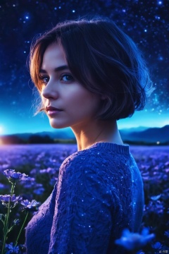 girl,night,blue light behind her,((Galaxy, Lens flare)),short hair,flower field,night sky,cinematic shot. Wallpaper. (Blue color schema),detailed background,a city in the distance,