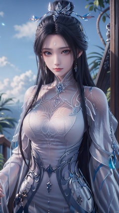 1girl, black hair, long hair, dress, solo, white dress, hair ornament, chinese clothes, facial mark, hair bun, forehead mark, earrings, mischevious smile, perfect body, scenery, sharp focus, best quality, masterpiece, detailed outfit, illustration, perfect eyes, finely detailed beautiful anime eyes, realistic skin, intricate details, best lighting, depth of field, ultra high resolution,cowboy_shot, dynamic pose, dynamic angle,