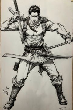 ((HRD, HUD, 8K)),((masterpiece, best quality)), highly detailed, soft light,Sketch, weapon, 1boy, solo, male focus, monochrome, sword, holding, holding weapon, greyscale, holding sword, dual wielding, katana, traditional media, scar, muscular, roronoa zoro, dated, sheath, scar on face, full body, fighting stance, scabbard, unsheathed, boots, standing, looking at viewer, mouth hold, signature, short hair, <lora:20240413-1712999239990:0.8>
