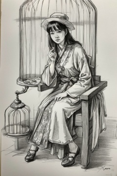 ((HRD, HUD, 8K)),((masterpiece, best quality)), highly detailed, soft light,Sketch, monochrome, greyscale, solo, sitting, bird, cage, traditional media, long sleeves, 1girl, signature, full body, birdcage, dress, fingernails, chair, hat, jewelry, chinese clothes, <lora:20240413-1712999239990:0.8>