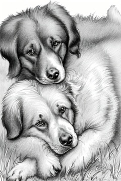 ((HRD, HUD, 8K)),((masterpiece, best quality)), highly detailed, soft light,Sketch, greyscale, monochrome, no humans, grass, animal, white background, animal focus, dog, hug, simple background,  <lora:20240413-1712999239990:0.8>