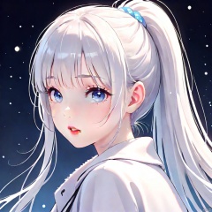1girl, solo, long hair, looking at viewer, blush, bangs, blue eyes, hair ornament, jacket, upper body, ponytail, white hair, sidelocks, parted lips, from side, lips, gradient, grey eyes, gradient background, eyelashes, white jacket, high ponytail, portrait, light particles, red lips