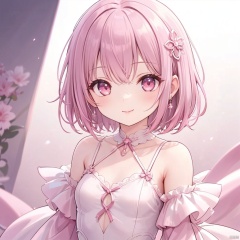{very detailed light},{painting},{{very fine 8K CG wallpaper}}, (Premium, Best Quality, Art, Beauty and Aesthetics: 1.2),1girl, solo, looking at viewer, smile, short hair, bangs, hair ornament, jewelry, closed mouth, pink hair, earrings, pink eyes, armor, lips, gradient, gradient background, portrait, pink lips, pink theme, loli