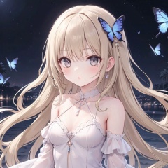 {very detailed light},{painting},{{very fine 8K CG wallpaper}}, (Premium, Best Quality, Art, Beauty and Aesthetics: 1.2),1girl, solo, long hair, breasts, looking at viewer, blush, bangs, blonde hair, hair ornament, dress, bare shoulders, jewelry, medium breasts, closed mouth, upper body, earrings, detached sleeves, white dress, mole, lips, see-through, parted bangs, grey eyes, mole under eye, night, wavy hair, bug, gem, butterfly, butterfly hair ornament