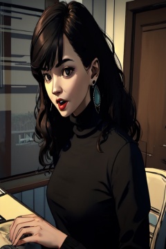 xxzr,<lora:xszr_v1.0:1>,1girl,solo,long hair,sweater,black hair,open mouth,looking at viewer,upper body,jewelry,black sweater,earrings,turtleneck,turtleneck sweater,indoors,bangs,wavy hair,