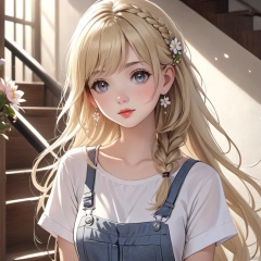 1girl, solo, long hair, looking at viewer, bangs, blonde hair, shirt, hair ornament, jewelry, closed mouth, white shirt, upper body, braid, flower, short sleeves, earrings, indoors, hair flower, medium hair, lips, grey eyes, light particles, stairs, overalls