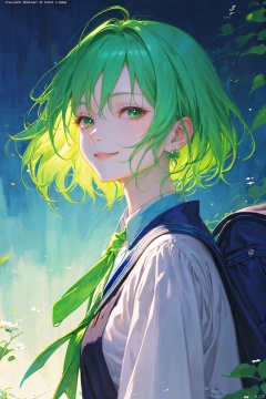 a woman in a green skirt, short hair, light green hair, earring, fluffy hair, black tie, smile, lovely fave, beautiful anime portrait, palace, carrying a schoolbag, digital anime illustration, beautiful anime style, a beautiful fantasy young girl, anime illustration, anime fantasy illustration, beautiful character painting, trending on artstration,(\personality\)