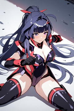 masterpiece,best quality,1girl, (ultra high res),solo,hair ornament,bare shoulders,very long hair,purple eyes,ponytail,purple hair,black gloves,tears,armor,boots,thighhighs,cleavage,(full_body:1.2),standing,fighting_stance,raiden mei,lying,sleeping,