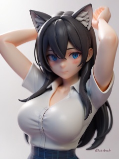 source_anime,figure style,1girl, solo, breasts, animal ears, blue eyes, shirt, large breasts, cat ears, short sleeves, looking at viewer, blush, eyebrows visible through hair, white shirt, long hair, hair between eyes, bangs, closed mouth, simple background, upper body, collared shirt, collarbone, grey background, black hair, hands up, arms up, grey hair, plaid, white background, brown hair, twitter username, ribbon, score_9,_up score_8_up,