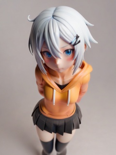 source_anime,figure style,1girl, solo, blush, blue eyes, thighhighs, skirt, white hair, hair ornament, black legwear, hairclip, hood, white background, looking at viewer, hoodie, simple background, zettai ryouiki, pleated skirt, collarbone, short hair, hair between eyes, arms behind back, black skirt, cropped legs, closed mouth, from above, hood down, score_9,_up score_8_up,