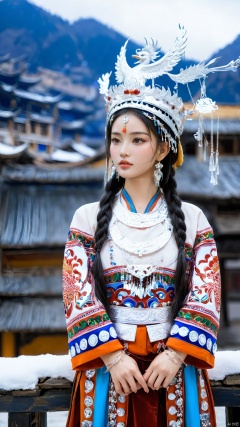 1girl, Black hair, bracelets, double braids, Miao Silver Phoenix Crown, Miao costume, crescent headdress, intricate jewelry, silver metal headdress, bird standing on hand, close-up, slight profile, depth of field, earrings, jewelry, lips, long hair, mountains, buildings, clouds, cloudy skies, necklaces, outdoors, railings, snow, solo,Miao ethnic clothing