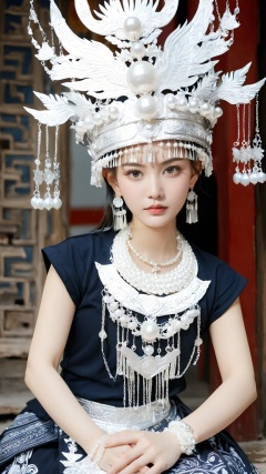 1girl, Sitting posture, sideways, hands on knees, black complex printed clothing, beads, earrings, silver metal jewelry, necklace, Miao Silver Phoenix Crown, complex headdress, complex jewelry, silver metal headdress, Miao clothing, pearl (gem) , Pearl Necklace, ring, Solo, upper body