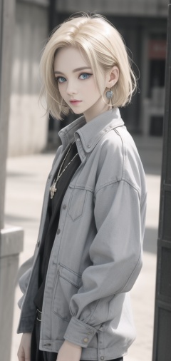 18hao,1girl,solo,blonde hair,blue eyes,earrings,jewelry,short hair,looking at viewer,android 18,<lora:18hao:0.8>,