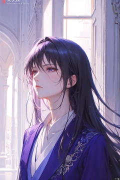 a woman in business attire, career women, business wear, purple suit, with neat hair, very long black hair, fluffy hair, serious expression, mature face, women who are elegant and a little bit indifferent, successful person, anime portrait, office, digital anime illustration, beautiful anime style, a beautiful fantasy female chairman, anime illustration, anime fantasy illustration, character painting, trending on artstration,(\personality\)