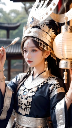 1girl, Lean sideways, upper body, above the hips, one hand lifting the lantern, the other hand touching the lamp body, beads, bracelets, braids, cups, Miao Silver Phoenix Crown, super complex headdress, complex jewelry, silver metal headdress, Miao costumes, black and white Miao costumes, hats, jewelry, lip ornaments, necklaces, solo