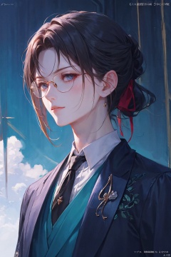 solo, a woman in business attire, career women, business wear, black tie, black blue suit, with neat hair, short black hair, with hair tied, square glasses, blue rimmed glasses, a confident smile, serious expression, mature face, women who are elegant and a little bit indifferent, successful person, anime portrait, palace, digital anime illustration, beautiful anime style, fantasy female chairman, anime illustration, anime fantasy illustration, character painting, trending on artstration,(\personality\)