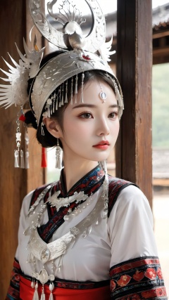 1girl, Back against the edge of the window, looking back, the window, hat, lips, Miao Silver Phoenix Crown, silver metal headdress, super complex headdress, crescent-shaped headdress, Miao clothing, black and white simple clothing, red Lips, short hair, independence, upper body, wooden windows, wooden walls, hand,Miao ethnic clothing