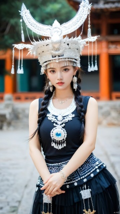 1girl, Leaning sideways, the upper half of the body leaning forward, above the buttocks, holding the hem of the skirt with both hands, looking at the camera, blurred background, braided double ponytail, depth of field, earrings, hat, Miao Silver Phoenix Crown, Miao costume, Black Miao costume, crescent headdress, complex jewelry, super complex metal headdress, silver metal headdress, jewelry, lips, long hair, watch audience, motion blur, necklace, street, architecture, photo (center) , photo reality, solo,