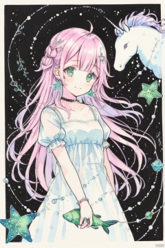 1girl,jewelry,pink hair,green eyes,ring,choker,earrings,solo,long hair,looking at viewer,constellation,star (symbol),holding,smile,traditional media,fish,puffy sleeves,short sleeves,puffy short sleeves,gem,makeup,unicorn,upper body,see-through,food,