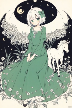 1girl,white hair,solo,short hair,flower,dress,bow,crescent moon,sitting,hair bow,horse,bird,unicorn,konpaku youmu,moon,green dress, comic drawing