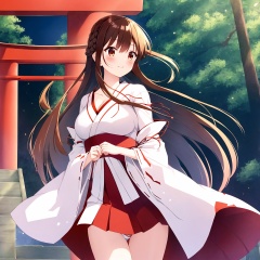1girl, solo, japanese clothes, breasts, long hair, smile, braid, miko, red eyes, bangs, holding, outdoors, wide sleeves, skirt, cleavage, hakama, blush, day, closed mouth, long sleeves, arrow \(projectile\), torii, very long hair, hakama skirt, multiple torii, red hakama, brown hair, hair between eyes, ribbon, hair ribbon, ribbon-trimmed sleeves, collarbone, white kimono, large breasts, kimono, ribbon trim, looking away, panties, underwear, red ribbon, side-tie panties, single braid, side braid, shiny hair, medium breasts, floating hair