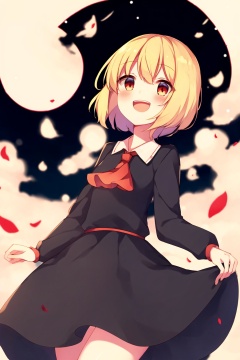 1girl, rumia, solo, open mouth, blonde hair, red eyes, night, smile, moon, ascot, short hair, looking at viewer, red ascot, ribbon, sky, hair ribbon, full moon, dress, shirt, long sleeves, star \(sky\), night sky, :d, white shirt, red ribbon, starry sky, blush, petticoat, petals, holding, black dress, bangs, frills, lantern, hair between eyes, outdoors, skirt, standing, feet out of frame, clothes lift