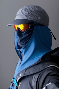 solo, 1boy, hat, jacket, upper body, male focus, hood, grey background, , helmet, goggles, baseball cap, mouth mask, grey headwear