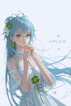 masterpiece,best quality,high quality,(colorful),[Artist sk (askzy)],[Artist wlop],Artist SHC, 1girl,Luo Tianyi (Vocaloid), clover, solo, long hair, green eyes, four-leaf clover, dress, flower, own hands together, looking at viewer, water, hair ornament, parted lips, very long hair, bangs, earrings, white background, jewelry, bare shoulders, upper body, white dress, hair flower, ribbon, simple background, hands up, blush