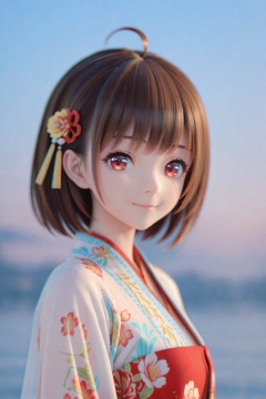 (masterpiece),(best quality),illustration,ultra detailed,hdr,Depth of field,(colorful),(chromatic aberration),mmd,1girl,solo,red eyes,looking at viewer,hair ornament,short hair,upper body,brown hair,blurry,ahoge,bangs,chinese clothes,see-through,depth of field,hanfu,smile,floral print,closed mouth,