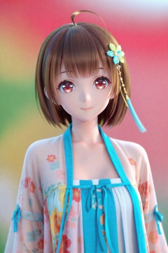 (masterpiece),(best quality),illustration,ultra detailed,hdr,Depth of field,(colorful),(chromatic aberration),mmd,1girl,solo,red eyes,looking at viewer,hair ornament,short hair,upper body,brown hair,blurry,ahoge,bangs,chinese clothes,see-through,depth of field,hanfu,smile,floral print,closed mouth,