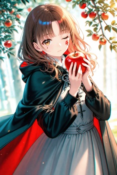 (masterpiece),(best quality),illustration,ultra detailed,hdr,Depth of field,(colorful),(chromatic aberration),1girl,brown hair,fruit,food,holding,one eye closed,cloak,apple,solo,hood,dress,looking at viewer,holding fruit,hooded cape,hooded cloak,hood down,holding food,cape,brown eyes,facial tattoo,branch,wavy hair,tree,medium hair,outdoors,one-eyed,black cloak,long hair,long sleeves,closed mouth,tattoo,grey dress,