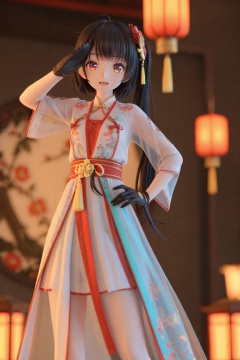 (masterpiece),(best quality),illustration,ultra detailed,hdr,Depth of field,(colorful),(chromatic aberration),mmd Style, Ling Yuan (Virtual Singer), 1girl, solo, long hair, red eyes, gloves, black hair, open mouth, side ponytail, looking at viewer, hand on own hip, lantern, salute, chinese clothes, smile, hair ornament, black gloves, see-through