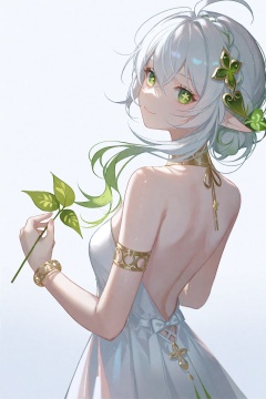 masterpiece,best quality,high quality,(colorful),[Artist sk (askzy)],[Artist wlop],Artist taya oco,solo,1girl,dress,long hair,green eyes,pointy ears,white dress,looking at viewer,smile,white background,white hair,cross-shaped pupils,multicolored hair,nahida (genshin impact),bare shoulders,green hair,simple background,braid,very long hair,holding,leaf hair ornament,backless outfit,symbol-shaped pupils,closed mouth,breasts,bracelet,gradient hair,hair between eyes,jewelry,backless dress,leaf,from behind,ahoge,bare back,hair ornament,