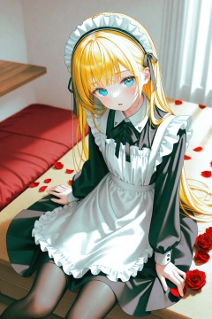 masterpiece,best quality,illustration,ultra detailed,hdr,Depth of field,(colorful),[Artist chen bin],[iumu],Artist roha,1girl,solo,long hair,rose,maid,blonde hair,maid headdress,flower,looking at viewer,red flower,apron,red rose,pantyhose,maid apron,dress,blush,petals,long sleeves,black pantyhose,sitting,frills,parted lips,blue eyes,black dress,white apron,rose petals,indoors,open mouth,