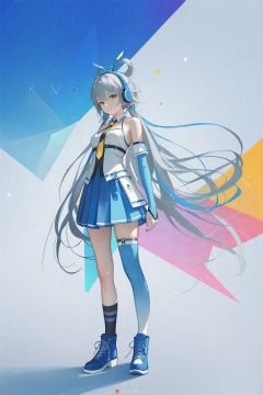 masterpiece,best quality,high quality,(colorful),[Artist sk (askzy)],[Artist wlop],Artist SHC, 1girl,Luo Tianyi (Vocaloid), solo, green eyes, asymmetrical legwear, long hair, single kneehigh, single sock, smile, hair rings, thighhighs, necktie, skirt, uneven legwear, single thighhigh, very long hair, looking at viewer, boots, socks, nail polish, full body, gloves, grey hair, mismatched legwear, bare shoulders, elbow gloves, pleated skirt, detached sleeves, kneehighs, breasts, headphones, sleeveless, standing, blue skirt, sidelocks, asymmetrical footwear, hair between eyes, blue footwear