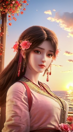 hle,1girl,solo,outdoors,(looking_at_viewer:1.2),headpiece,jewelry,chinese clothes,earrings,hair flower,hair ornament,jitome,outdoors,sky,flower,tree,cloud,sunset,pink flower,sun,sunlight,<lora:火灵儿-上界装扮-王导:0.8>,<lora:玫瑰花场景-王导:0.8>,over the sea,sand,pink roses,