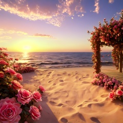 outdoors,sky,flower,tree,cloud,sunset,pink flower,sun,sunlight,<lora:火灵儿-上界装扮-王导:0.8>,<lora:玫瑰花场景-王导:0.8>,over the sea,sand,pink roses,scenery,