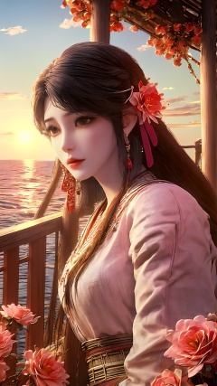 hle,1girl,solo,outdoors,(looking_at_viewer:1.2),headpiece,jewelry,chinese clothes,earrings,hair flower,hair ornament,jitome,outdoors,sky,flower,tree,cloud,sunset,pink flower,sun,sunlight,<lora:火灵儿-上界装扮-王导:0.8>,<lora:玫瑰花场景-王导:0.8>,over the sea,sand,pink roses,