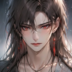 solo, long hair, looking at viewer, brown hair, black hair, red eyes, 1boy, jewelry, closed mouth, upper body, male focus, earrings, necklace, lips, wet, portrait, rain