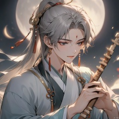 solo, long hair, hair ornament, 1boy, holding, jewelry, upper body, ponytail, grey hair, male focus, earrings, blurry, chinese clothes, moon, instrument, music, playing instrument, holding instrument, hanfu, flute