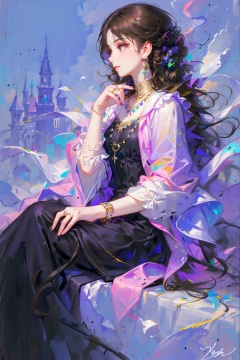 1girl, solo, long hair, brown hair, black hair, long sleeves, dress, jewelry, sitting, closed mouth, earrings, hand up, signature, necklace, black dress, bracelet, profile, ring, stairs, multiple rings,meiren