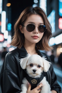 A girl with a maltese puppy behind, cyberpunk, (aviator sunglasses), high-tech clothing, dynamic pose, looking at the viewer, from below, best shadows, complex, depth of field, long hair, messy hair, Tokyo city background, city at night,