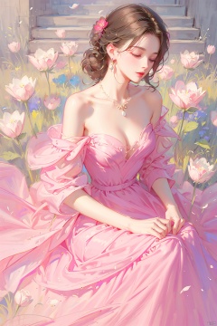 1girl, solo, breasts, brown hair, black hair, hair ornament, dress, cleavage, bare shoulders, jewelry, medium breasts, sitting, closed mouth, collarbone, closed eyes, flower, earrings, necklace, off shoulder, bracelet, lips, pink dress, stairs, long dress,meiren