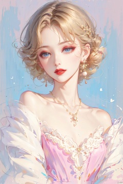 1girl, solo, looking at viewer, short hair, blue eyes, blonde hair, hair ornament, dress, bare shoulders, jewelry, closed mouth, upper body, earrings, necklace, off shoulder, lips, makeup, red lips,mieren